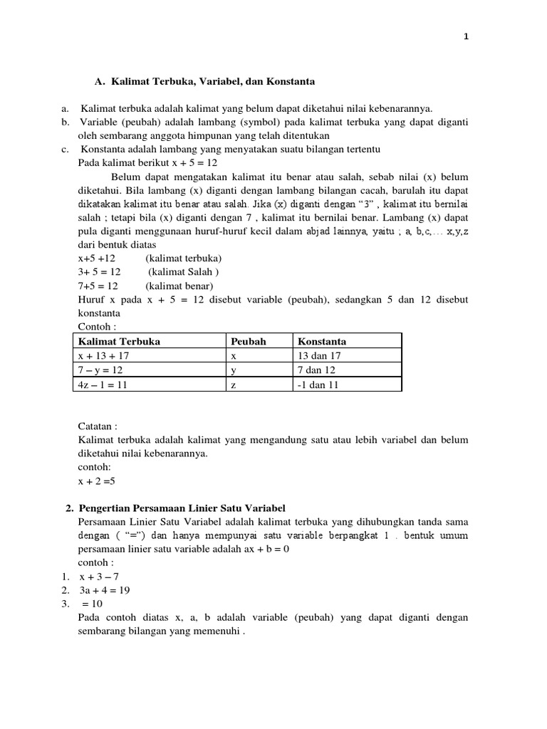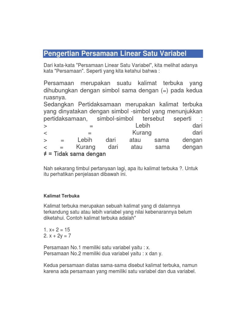 Persamaan linear satu variabel adalah kalimat terbuka yang dihubungkan tanda sama dengan contoh : Berikut ini merupakan pembahasan tentang persamaan dan pertidaksamaan linear yang meliputi pengertian pernyataan, pengertian kalimat terbuka, contoh pernyataan, contoh kalimat terbuka. Ibu naik pitam mendengar aku mendapat nilai buruk 3. Mengetahui apa itu fill in? Penjelasan di atas mungkin sudah cukup jelas maka terdapat juga beberapa contoh berikut beberapa contoh kalomat dari persamaan kata adalah sebgai berikut